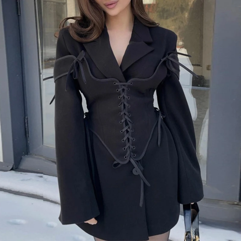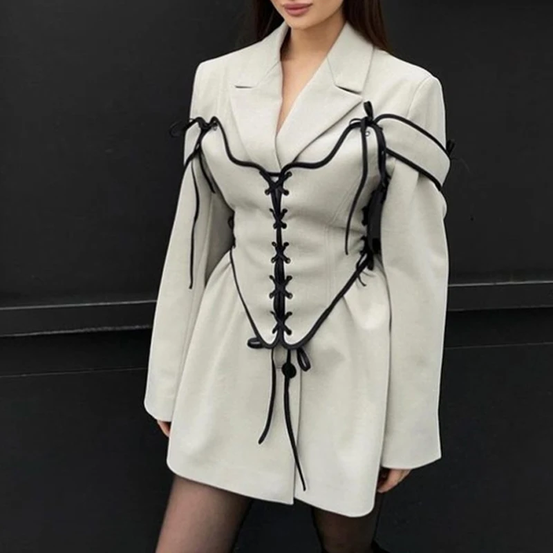 Long Sleeves Girls Blazer With Bandage Waist Design Commuter Lapel Tweed Women Suit Polyester Casual Blazer